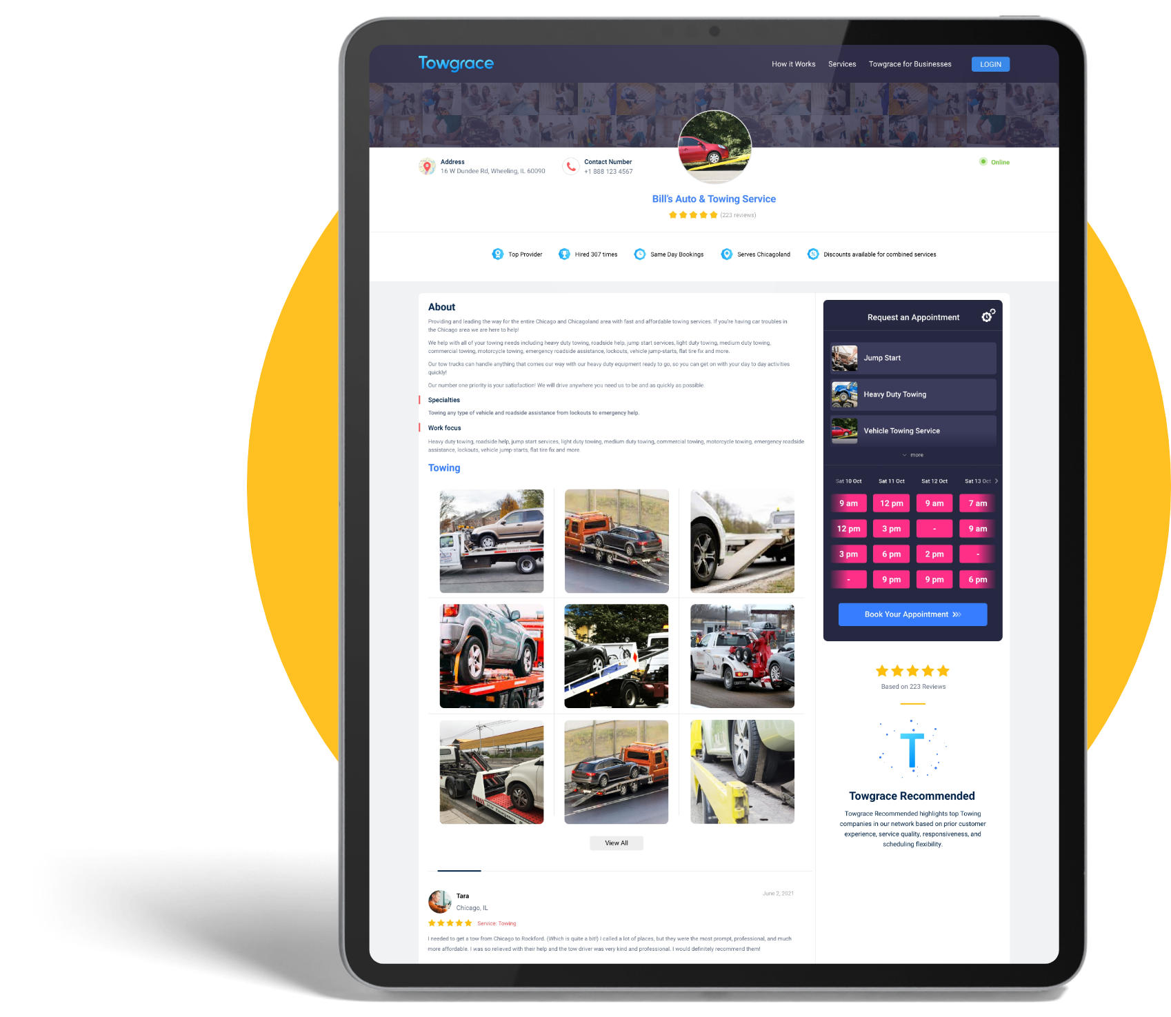 People can easily see your business' testimonials and reviews, plus your Towgrace Star ranking.